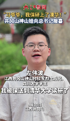 “2016年2月2日,习爷爷到我家的时候,我还是读小学六年级的一名小学生。2022年我考上了四川大学生物科学专业。如今,我又被保送到清华大学读研了!”9月30日,井冈山市茅坪镇神山村21岁的左伟波,激动地向记者讲述他的故事。左伟波是革命烈士左桂林的后代,也是神山村考上“双一流”大学的第一人。