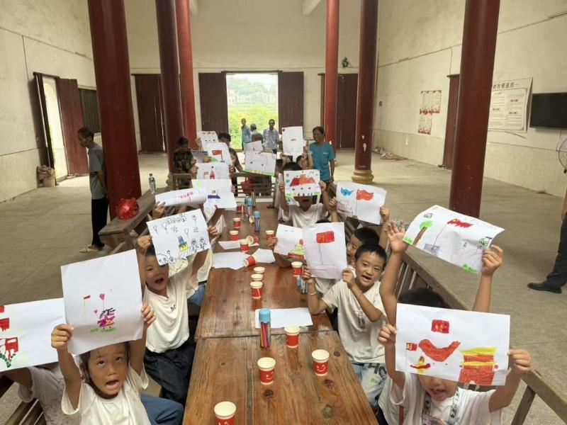 与敬老区的温馨不同,儿童活动区满是欢声笑语。“童心庆华诞”互动环节里,志愿者们引导孩子们围绕“我心中的祖国”“美丽家乡”创作绘画。有的孩子认真涂画五星红旗,有的勾勒家乡的稻田与小河,稚嫩笔触下满是对祖国、对家乡的热爱。