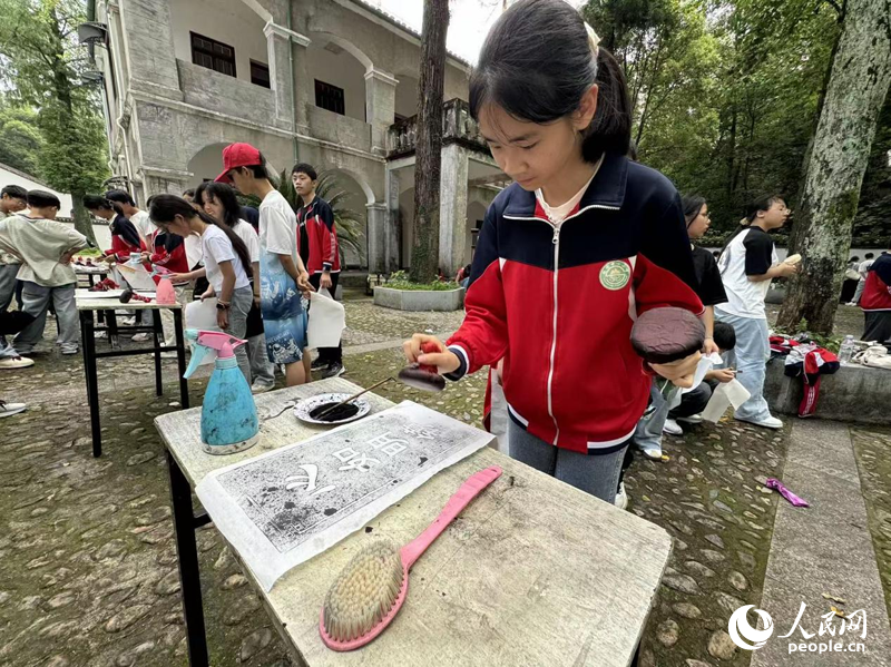 来白鹿洞书院研学的学生们正在体验拓印。人民网记者 罗娜摄