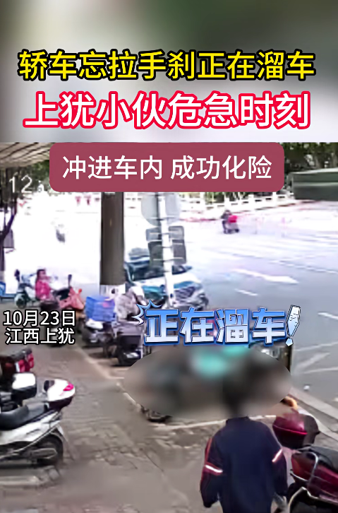 轿车忘拉手刹正在溜车 上犹小伙危急时刻冲进车内 成功化险