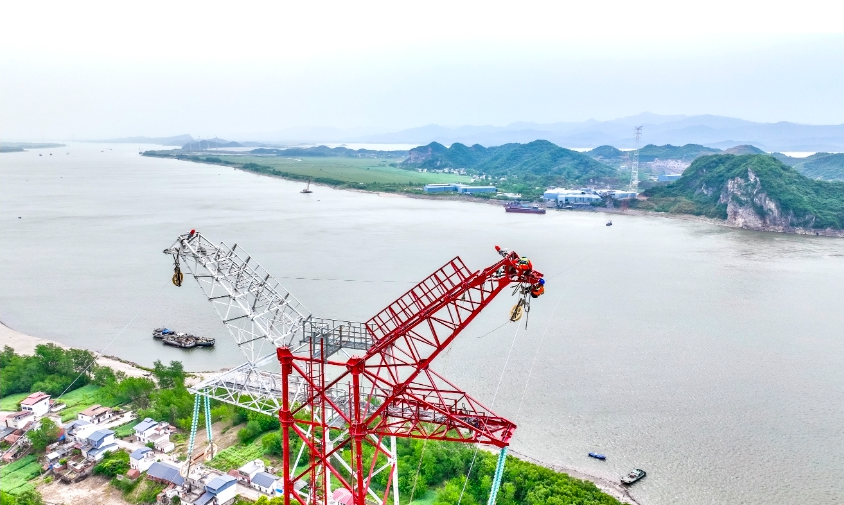 攻坚:172.8米跨江架线成功