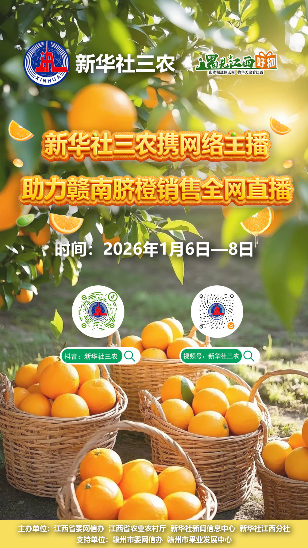 1月6日至8日,锁定“新华社三农·遇见江西好物”直播间及各产区直播间,让我们一同见证赣南脐橙的黄金品质,感受红色土地上产业兴、农民富的生动实践,将这份饱含阳光与匠心的甜蜜,带给千家万户。(梁楚烟)