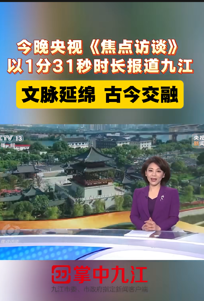 1月7日,央视<<焦点访谈>>"新时代长江之歌"专栏关注!九江自2021年底长江国家文化公园建设启动以来,将沿岸自然风貌与人文历史有机融合,让琵琶亭、浔阳楼等文化地标"活"起来,尽显古今交融新活力。