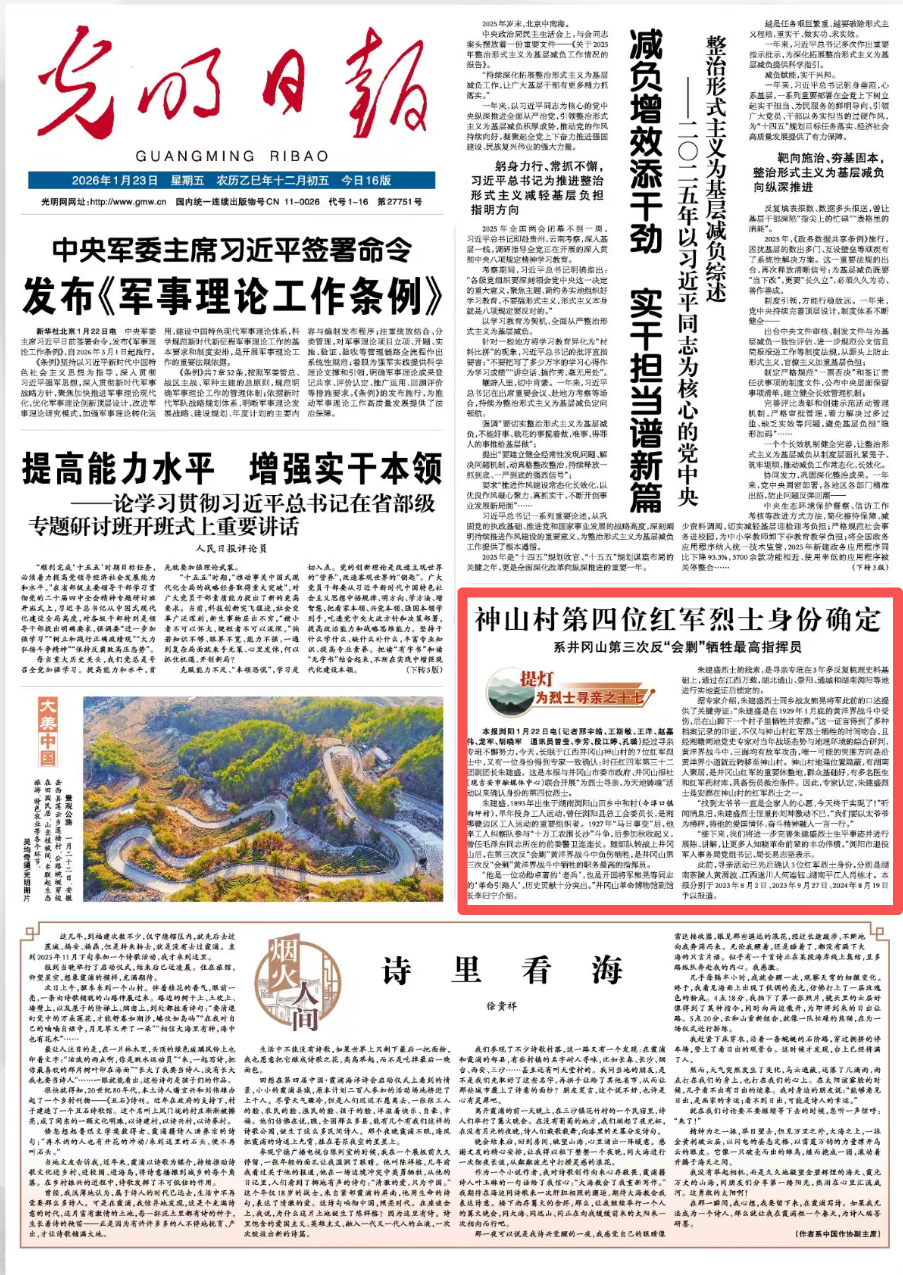 “仗剑出乡关,血染井冈山;杳踪近百年,今日终‘团圆’。”一座丰碑背后,是光明日报与神山村之间的不尽情缘,更是“将寻亲进行到底”的决心与信念。