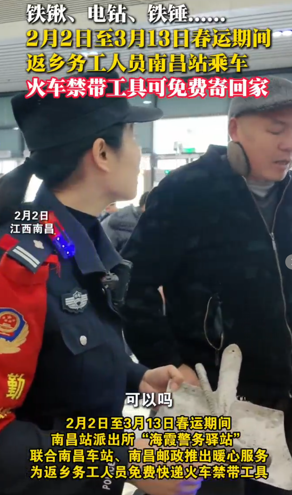 铁锹、电钻、铁锤......2月2日至3月13日春运期间返乡务工人员南昌站乘车火车禁带工具可免费寄回家