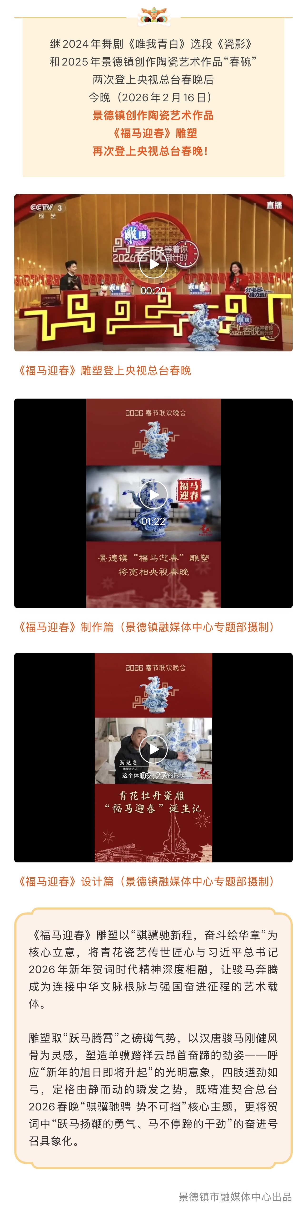 今晚,景德镇又火了!《福马迎春》亮相央视春晚!