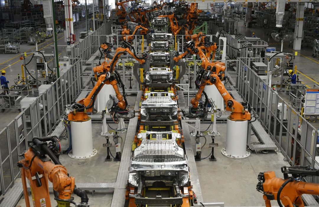 但更直观的进步,在园区、在车间里。走进江铃股份富山工厂,焊装车间内,440台库卡工业机器人整齐排开,机械臂上下翻飞,AGV无人小车沿着既定轨道有序送料。每2分钟,就有一台新能源整车下线。