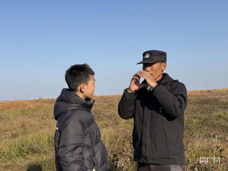 袁文斌正在给袁梓宸展示灰鹤叫声(央广网见习记者尹博摄)