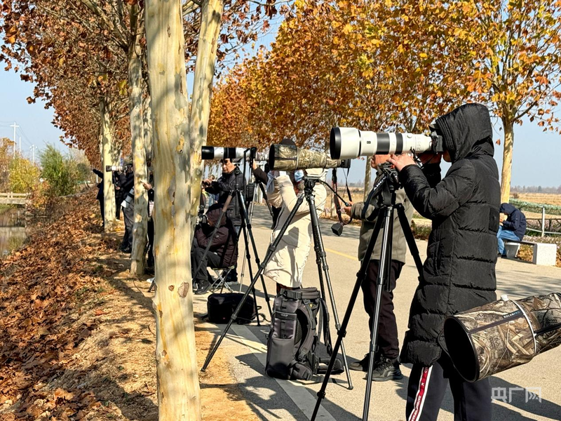 举着“长枪短炮”拍摄候鸟的摄影爱好者们(央广网记者周蓓摄)