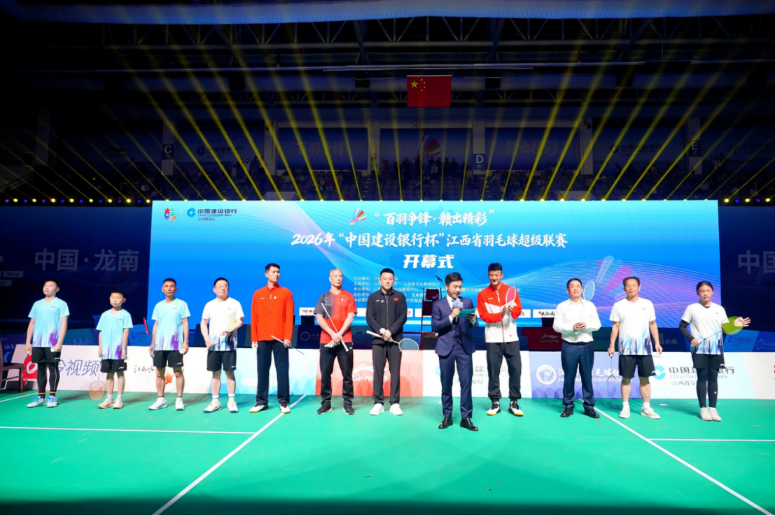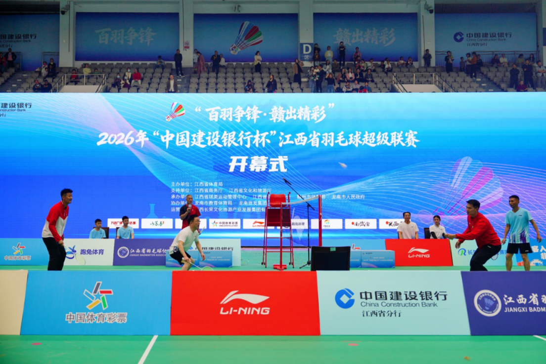 围屋作幕,羽球为媒。3月27日晚,“百羽争锋·赣出精彩”2026年“中国建设银行杯”江西省羽毛球超级联赛开幕式(以下简称“赣羽超”)在龙南市体育中心举行。作为江西省首个实现百县(市、区)全覆盖的羽毛球赛事,本次联赛吸引了全省104个县(市、区)的代表队参与。