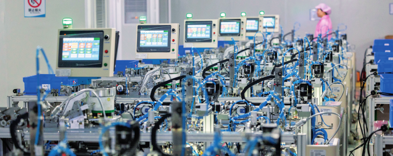 在江西赣州讯康电子科技有限公司,工作人员从T1—T2全自动穿环机旁走过,该机器生产磁性元器件(资料照片) 才扬摄 / 本刊