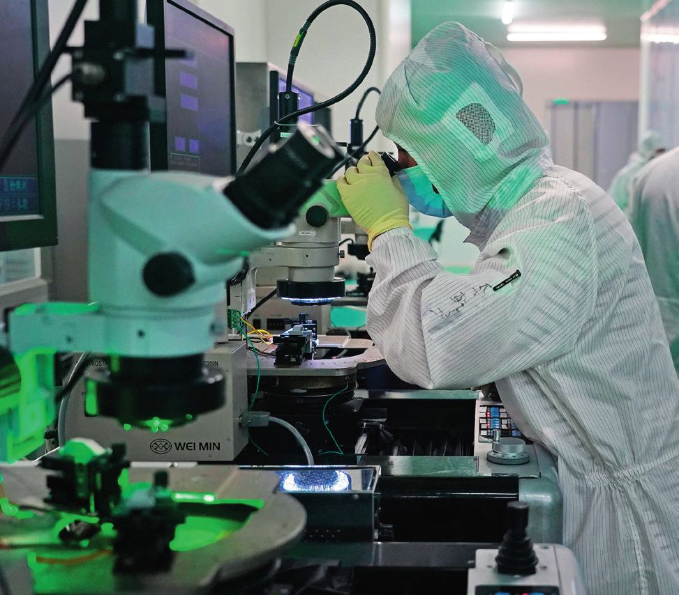 在位于江西省南昌市的南昌大学国家硅基LED工程技术研究中心,技术人员正在对芯片进行电性测试(2024 年 4 月 3 日摄) 万象摄 / 本刊