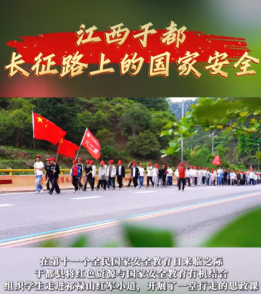 在第十一个全民国家安全教育日来临之际,于都县将红色资源与国家安全教育有机结合,组织学生走进祁禄山红军小道,开展了一堂行走的思 政课。