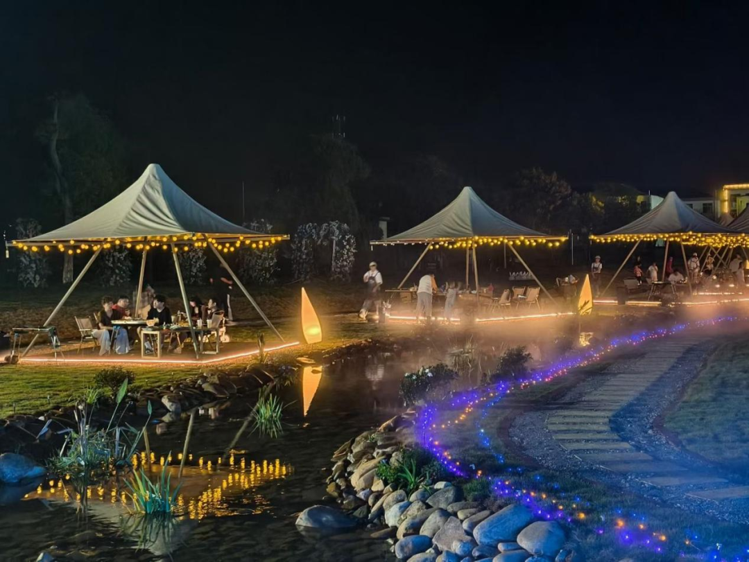 夜幕降临,营地热闹升级。露营区灯光温柔,与烧烤区烟火交融,温馨满溢。游客们化身“小厨师”,翻转肉串,“滋滋”声奏响美味交响曲。晚上8时,中央舞台变身欢乐海洋,乐队登场点燃气氛,电音表演搭配绚丽灯光,游客们随之摇摆。随后,小型烟花秀绚烂上演,照亮整个营地。