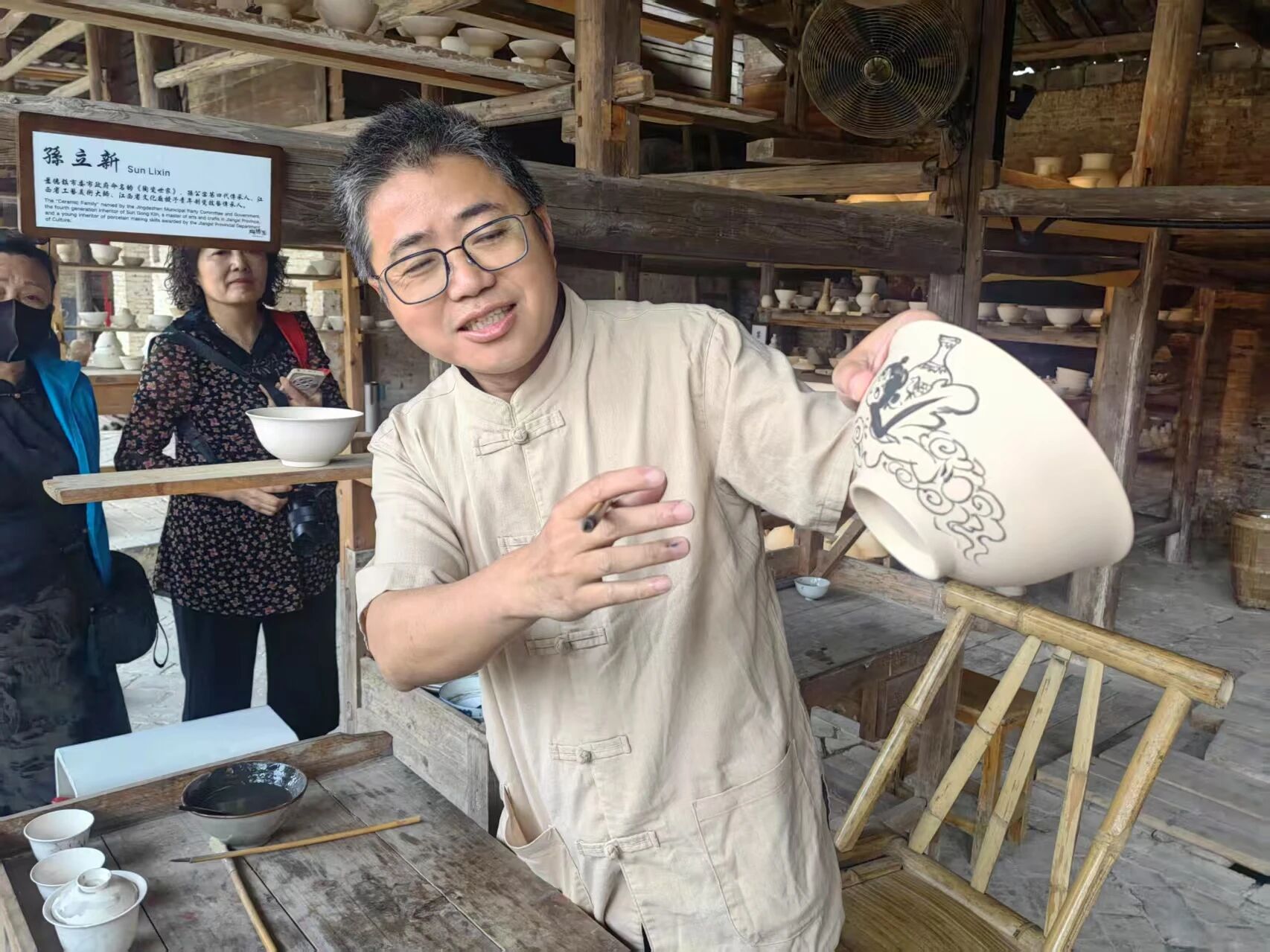 他从事施釉工作已经四十多年了,这门技艺的要领就是心要静、手要稳、眼要准。游客涌入作坊避雨,不少人被叶冬喜的操作吸引,并为之折服,大家拿出手机拍摄记录,发出阵阵赞叹。