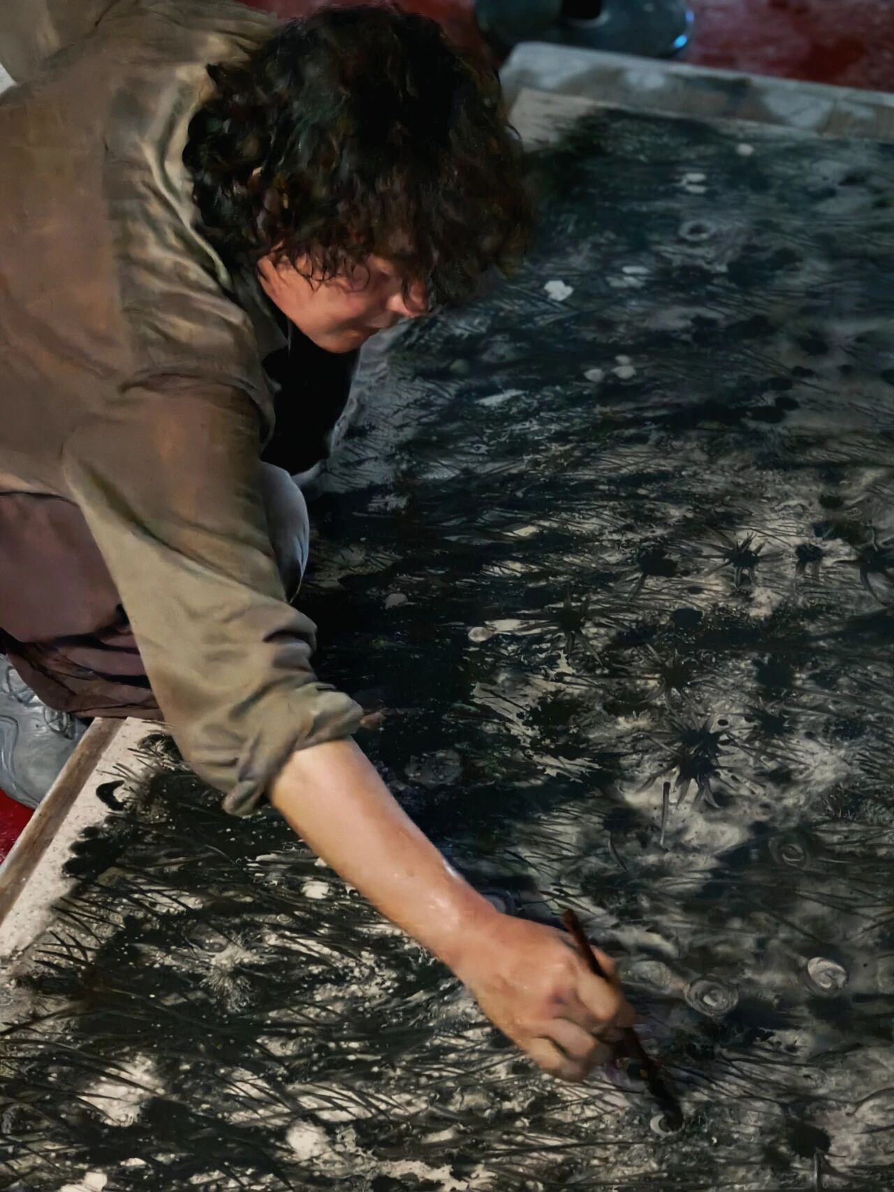 吴江中曾做过一只盘器,用了一吨的泥料。拉坯时,七八个身强体壮的汉子齐上阵,两人主打,其余人辅助。为了更好地操作,匠人要近乎趴着拉坯,这时就需要有人在身后扯着腰以保持平衡,架势形如纤夫拉船。与之不同的是,拉坯时不喊号子,众人须保持安静,同频呼吸,才能精准掌握力度,坯体才能厚薄一致。