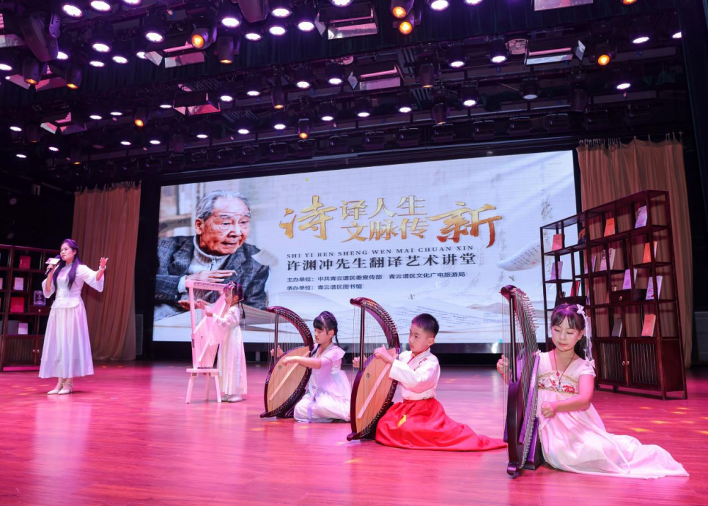 活动现场还同步开展了中英双语诗歌朗诵与民乐表演相融合的艺术展演,以多元艺术形式呈现许渊冲译作的独特魅力。《春江花月夜》《赋得古原草送别》等经典篇目,经中英双语吟诵与古筝、琵琶、箜篌等传统乐器的现场演绎,将许渊冲先生倡导的“意美、音美、形美”三美统一翻译境界具象化,让在场观众感受到中西文化碰撞的艺术张力。