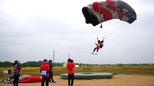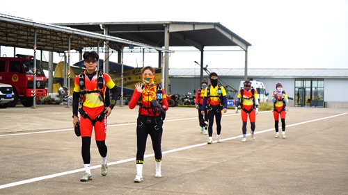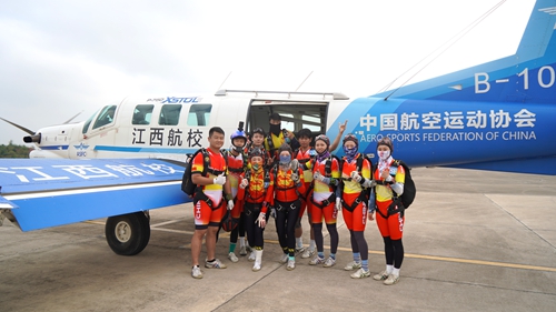 下午1点,国家集训队队员在整理检查跳伞装备后,有序登机进行提前场地适应性训练。