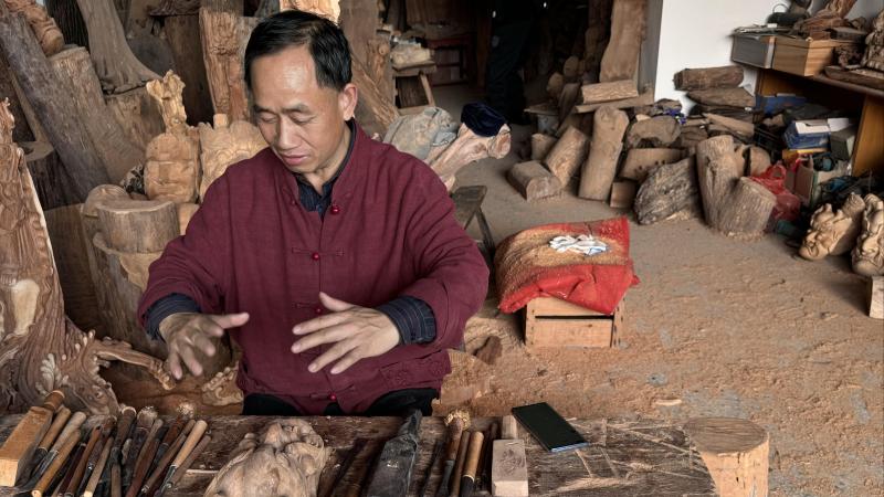 冬日暖阳,在江西省抚州市南丰县,随着刻刀起落,一张木雕而成的傩面具在罗春明的手中初步成型,他的脚下踩着厚厚的木屑,木香弥漫了整间屋子。