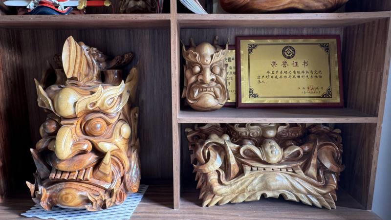 傩面具雕刻是由跳傩舞衍生的一项传统技艺。罗春明是南丰傩面具雕刻的代表性传承人,他的工作室是网络名人们揭开傩文化神秘面纱的第一站。这间工作室在一栋民房的一楼,一半用来雕刻新作,一半用来展示成品。雕刻、打磨、喷漆……多项繁琐的工序,在这里能够全部完成。