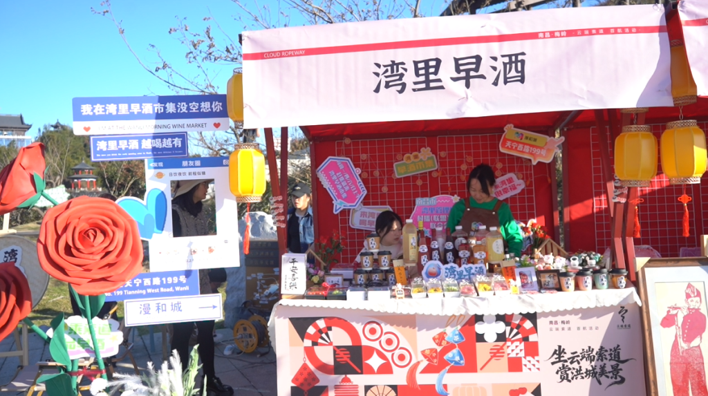 走出索道上站出口,还能看见一座 “小小市集”,不少流动摊贩整齐排列,其中就有“湾里早酒市集”的招牌。